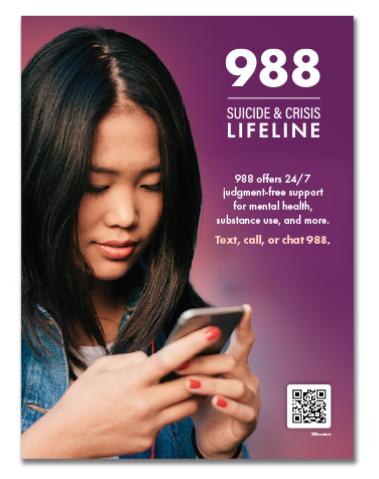 This 18" x 24" poster helps publicize the new 988 Suicide & Crisis Lifeline and provides a QR code to access the live-saving resource. This poster is designed to be placed in schools, community centers, counseling offices, clinics, and other settings wher
