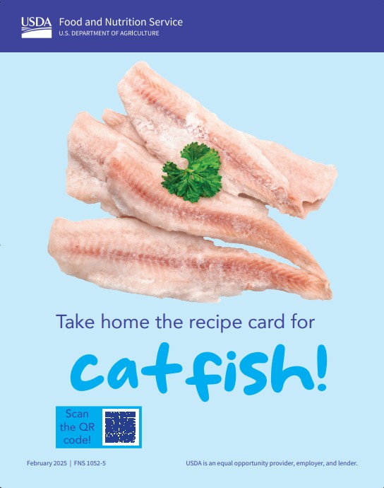 Hang window clings on the cooler door to give shoppers new ideas on how to use foods from the FDPIR food package. This shelf-talker encourages trying the Cajun Catfish recipe linked at the QR code. Each item includes one 8.5 x 11-inch window cling. |