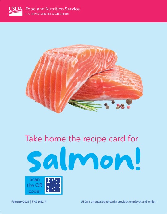 Hang window clings on the cooler door to give shoppers new ideas on how to use foods from the FDPIR food package. This shelf-talker encourages trying the Lemon Pepper Salmon Patties recipe linked at the QR code. Each item includes one 8.5 x 11-inch window cling. |